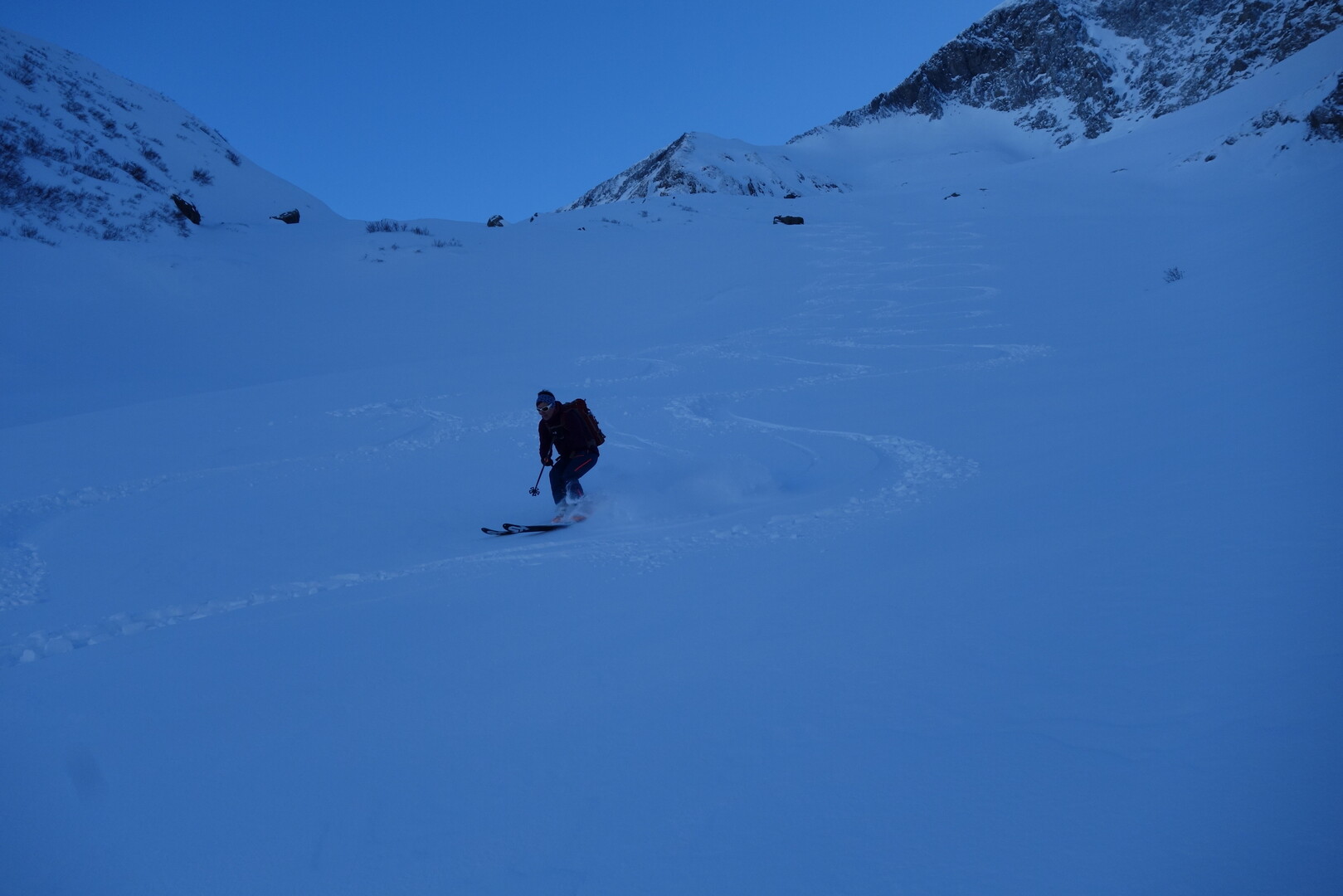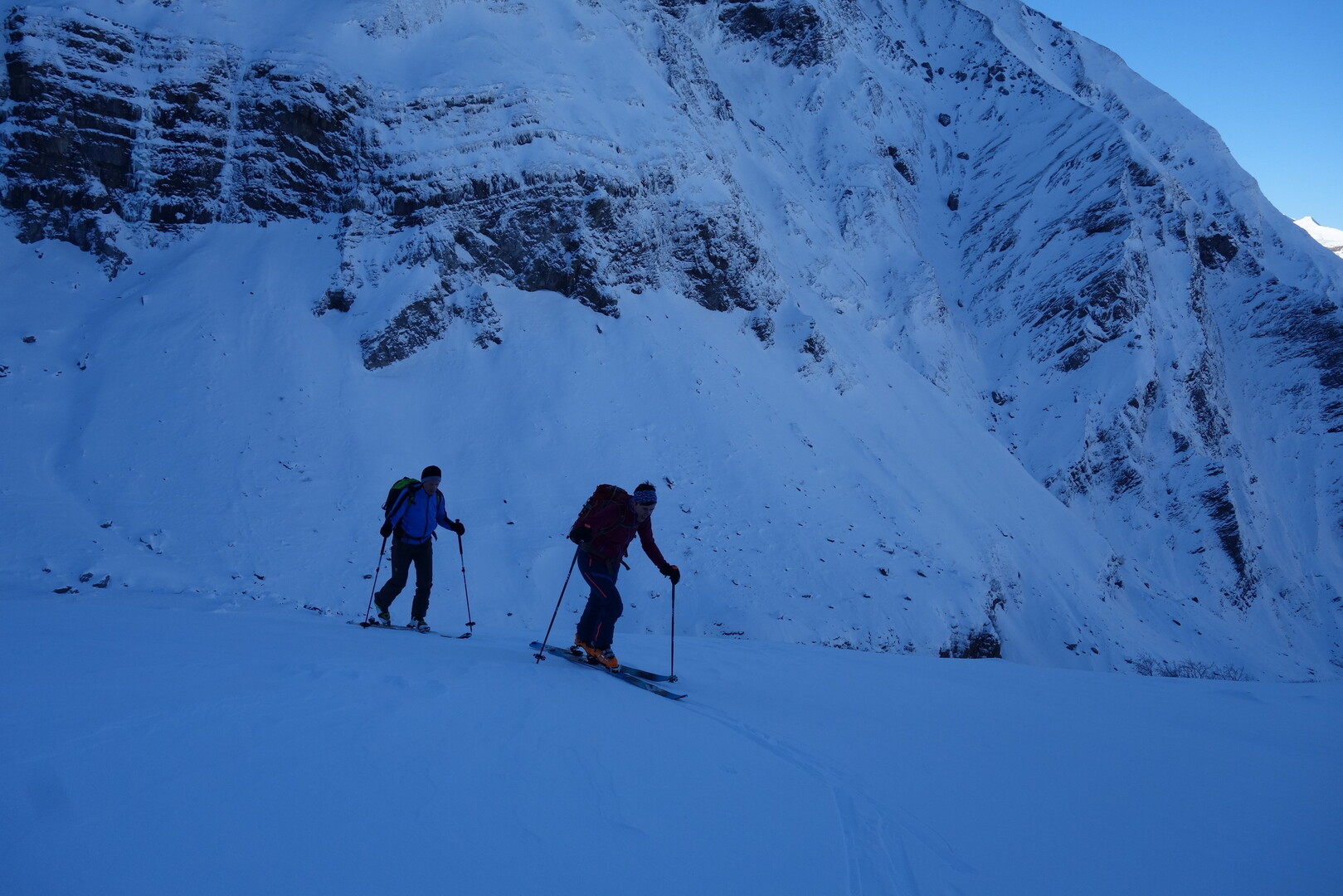 Nach dem eher ruppigen Beginn, wo eine sichere Skitechnik unumgänglich ist, werden wir von einem wunderschönen Skitourengelände empfangen, das uns Freiheiten zugesteht, wo wir unsere Spuren legen sollen. Dank der schattigen Lage, können wir hier oft mit besten Schneeverhältnissen rechnen. Für Sonnenanbeter ist diese Skitour nicht geeignet.