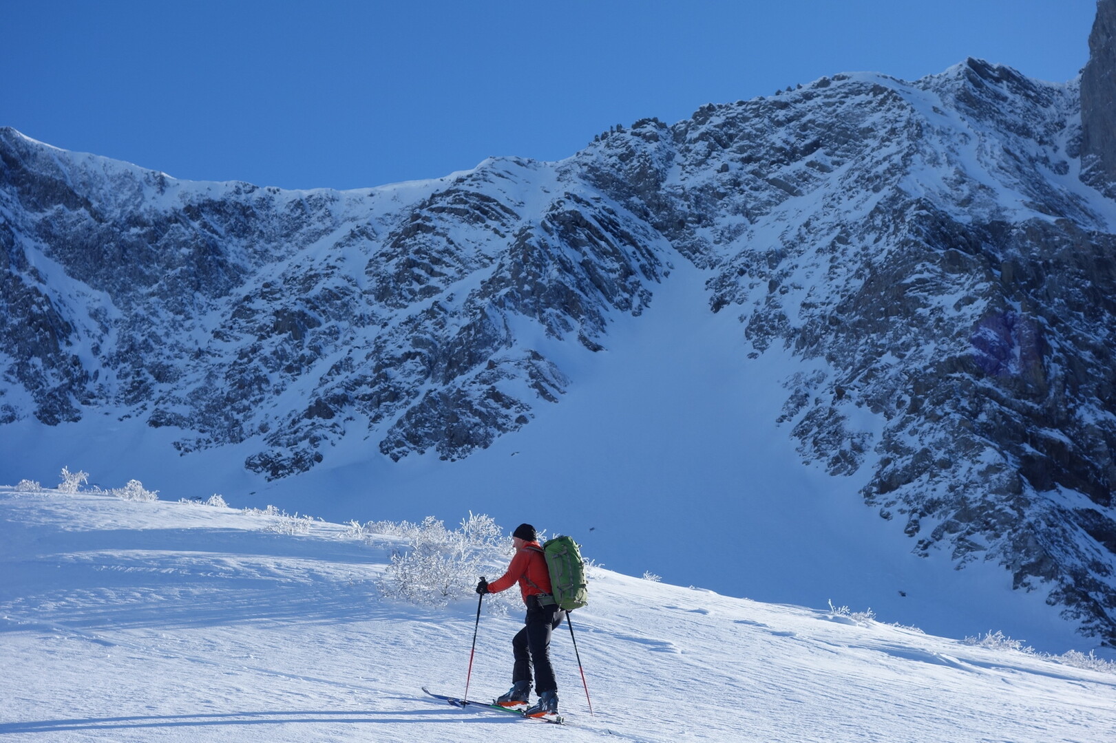 Wo der Schatten mehr als Sonne bietet: Ein unkonventionelles Skitourenerlebnis im Banne massiger Berge. Zwar beginnt die Tour mit einem etwas ruppigen Einstieg, doch ist das der Preis, um die wunderschönen Hänge und Mulden im oberen Bereich ohne Fremdeinwirkung zu befahren und zu geniessen.