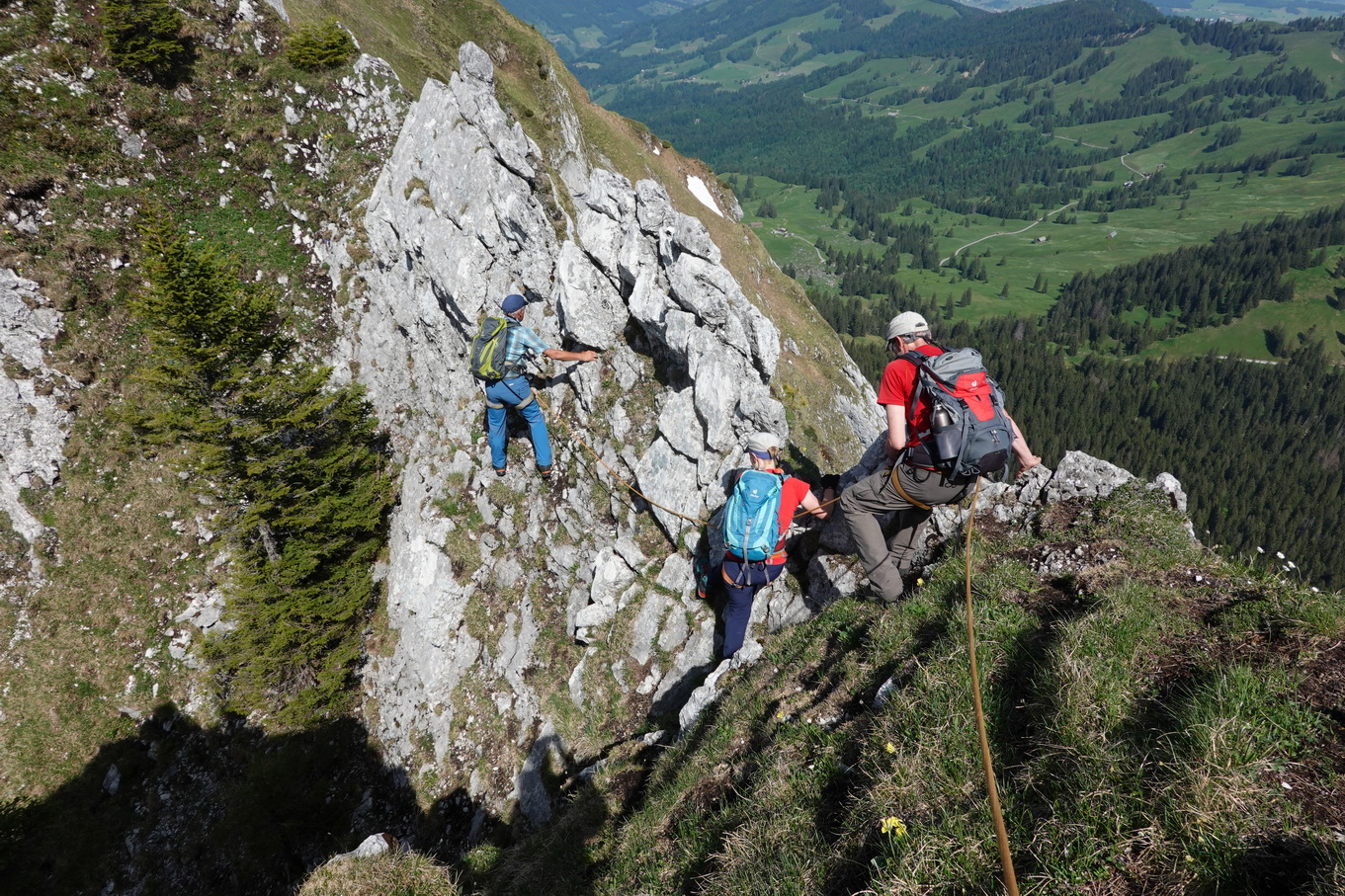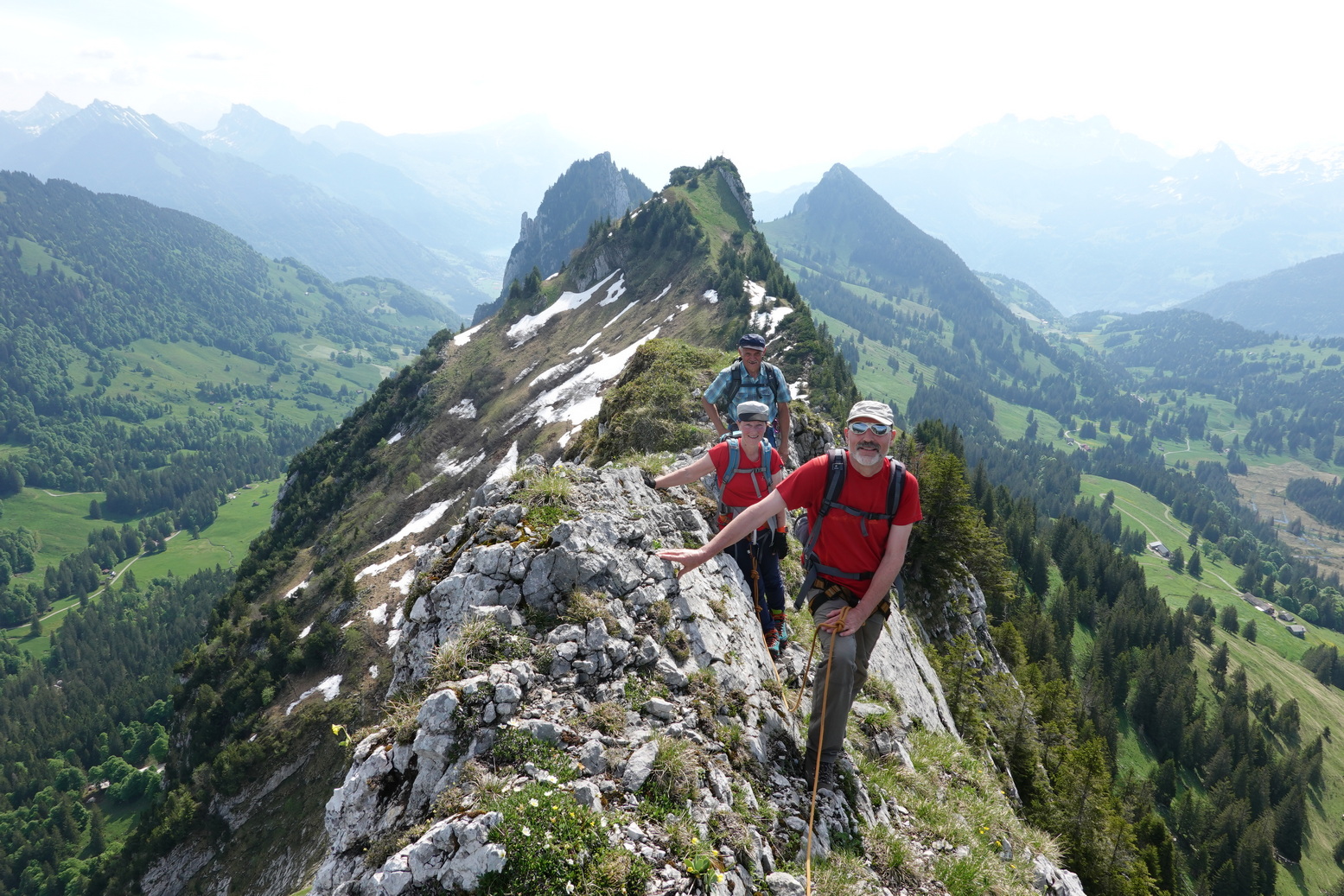 Nach dem einfachen Zugang zum Grateinstieg, folgt luftiges, karriges Felsengelände, dass gespickt ist mit allerlei Hindernissen, nicht nur felsiger Art. Kleine Bäume, Wurzelstöcke, Querbänder, Grasnarben koexistieren mit eindrücklichen Gratabschnitten, wo ab und zu der eigene Gleichgewichtssinn gefordert wird. Eine tolle, vielfältige Alpinwanderung in nächster Nähe. Übrigens eignet sich diese Gratüberschreitung als ideale Testtour, für jene Kandidaten, welche sich unsicher sind, wie es mit ihrer Schwindelfreiheit und Trittsicherheit bestellt ist. Selbstverständlich sind Sie am Seil des Bergführers bestens aufgehoben.
