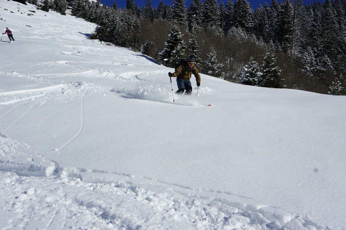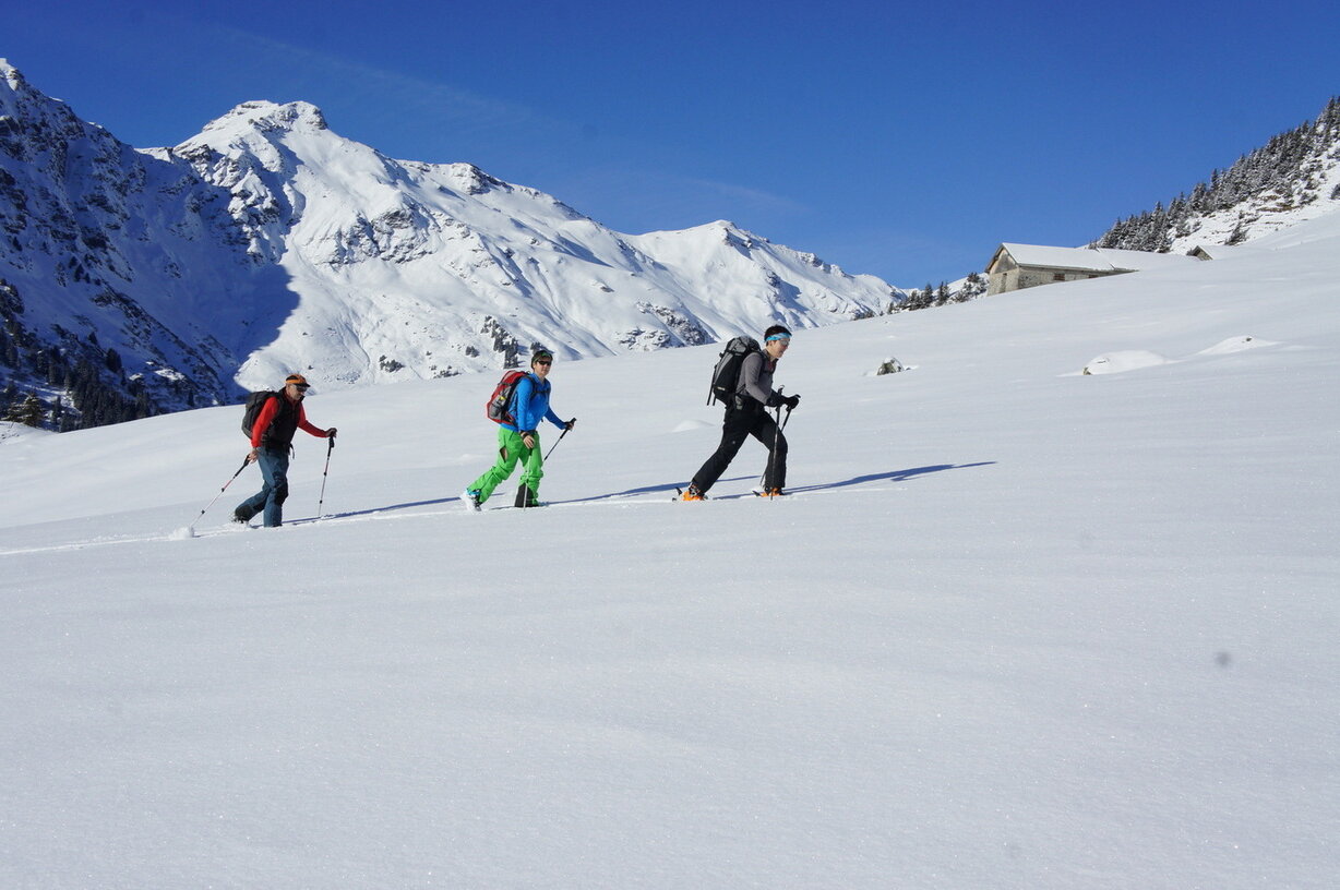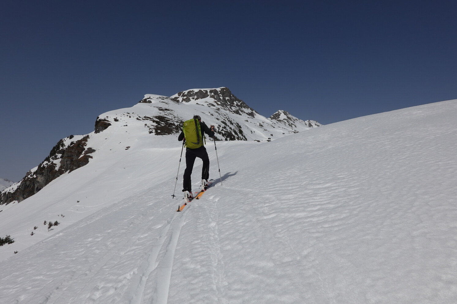 In dieser Ecke kreuzen gewöhnlich eher wenige Skitouristen auf. Nach einem entspannten Tallauf, schlüpfen wir durch einen versteckten Pfad, der uns zu einer Waldlichtung führt. Darauf folgen offenene Baumbestände in moderat ansteigendem Gelände. Die letzten 150 Höhenmeter erfordern da und dort eine Spitzkehre. Vom Gipfel, der genau genommen ein lieblicher Rücken ist, geniessen Sie rundherum einen prächtigen Ausblick. Nicht nur in die umliegenden Berge, sondern auch Richtung Tal, wo unverspurte Schneehänge ungeduldig darauf warten, von Ihnen befahren zu werden.