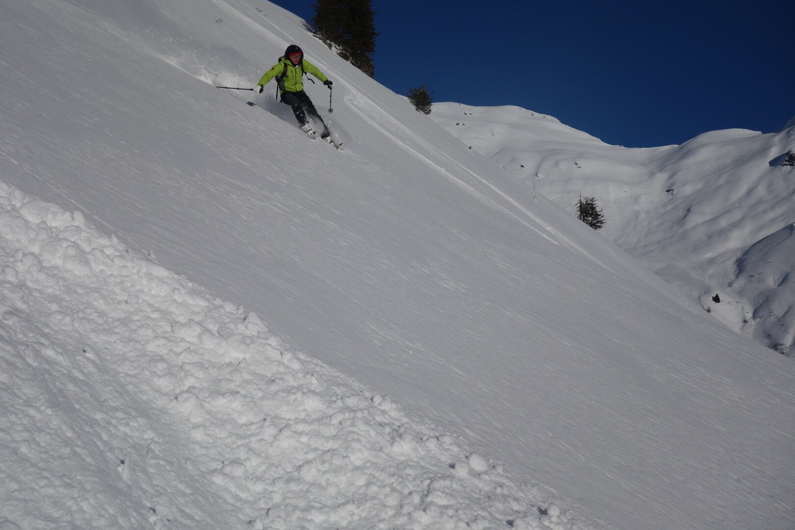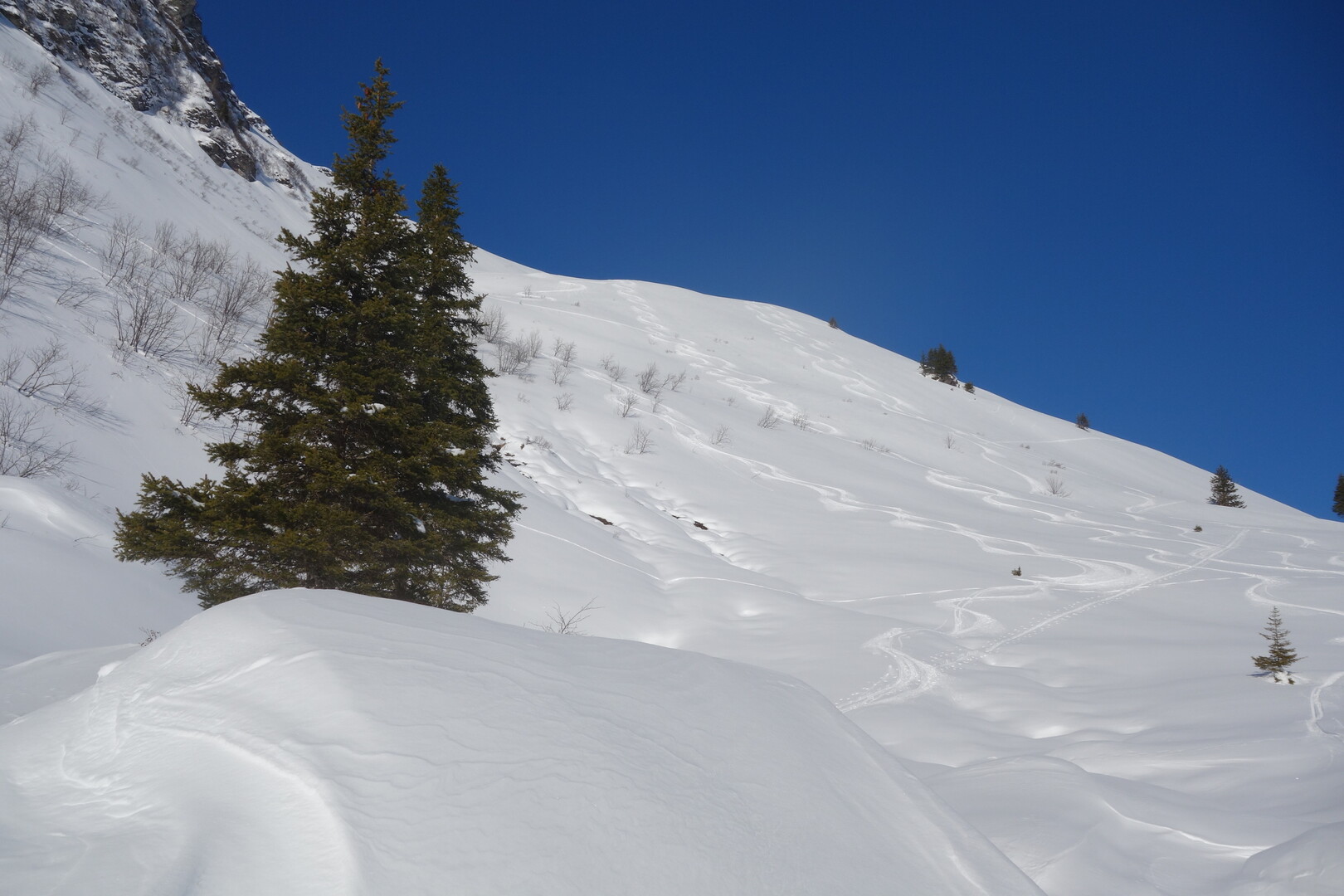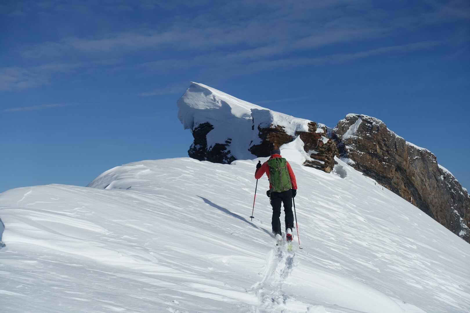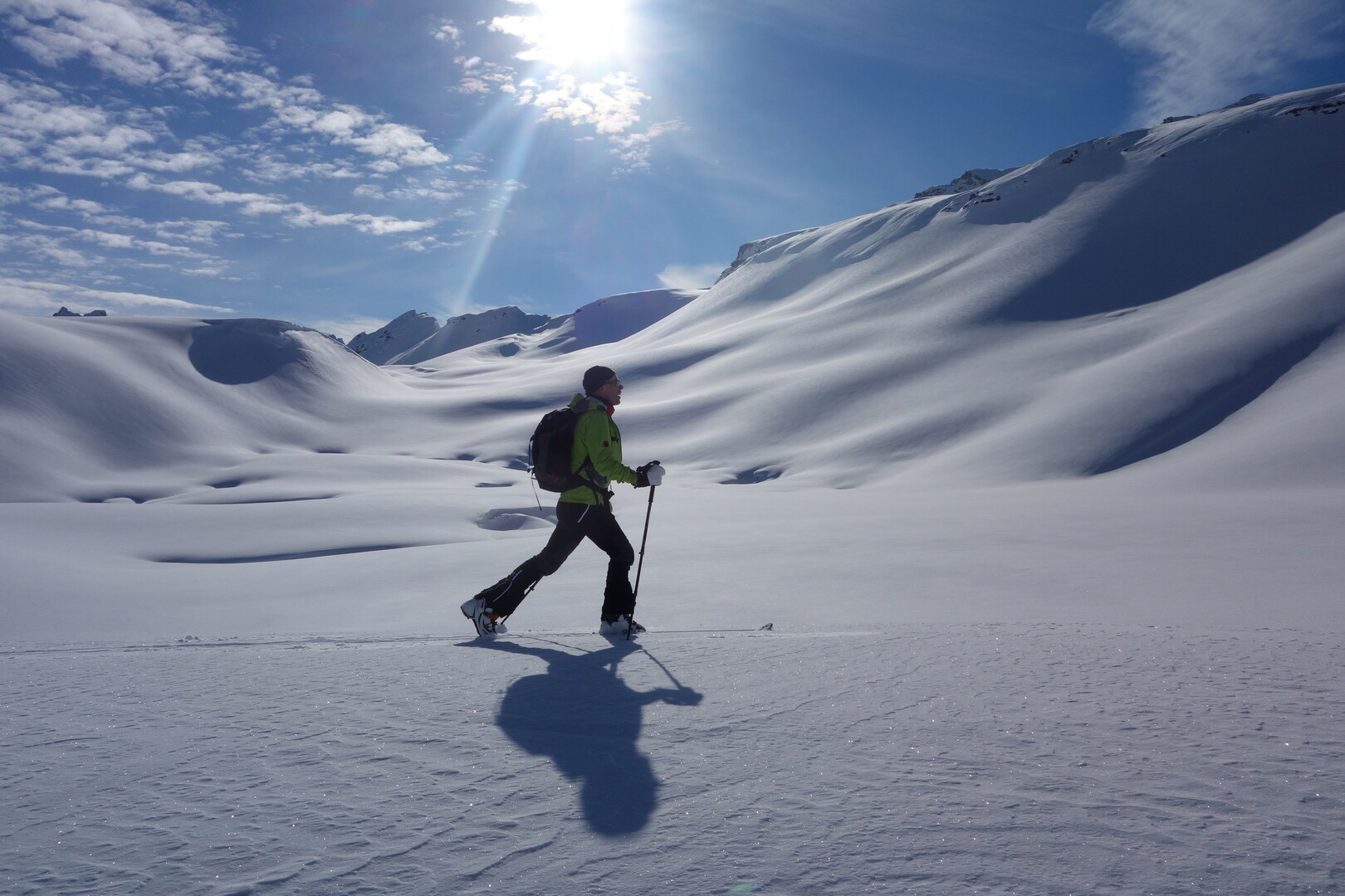 Zugegeben. Etwas Marschaufwand ist erforderlich, um in diese verlassene Gegend vorzustossen. Sie wissen es, alles eine Sache der inneren Einstellung. Diese justieren Sie auf zwei Stunden, bis es dann "richtig" losgeht. Vor Ihnen liegt nun ein verträumtes Skitourengelände mit grossen Hängen, runden Kuppen, kurzen Ebenen an die sich ebenmässige Mulden anschliessen. Nur zu gut stellen Sie sich jetzt schon vor, wie und wo Sie die eigene Abfahrtsspur reinziehen. Abschliessend führt unser Weg auf eine luftige Schneide, welche eine überraschende Aussicht für Sie bereithält.
