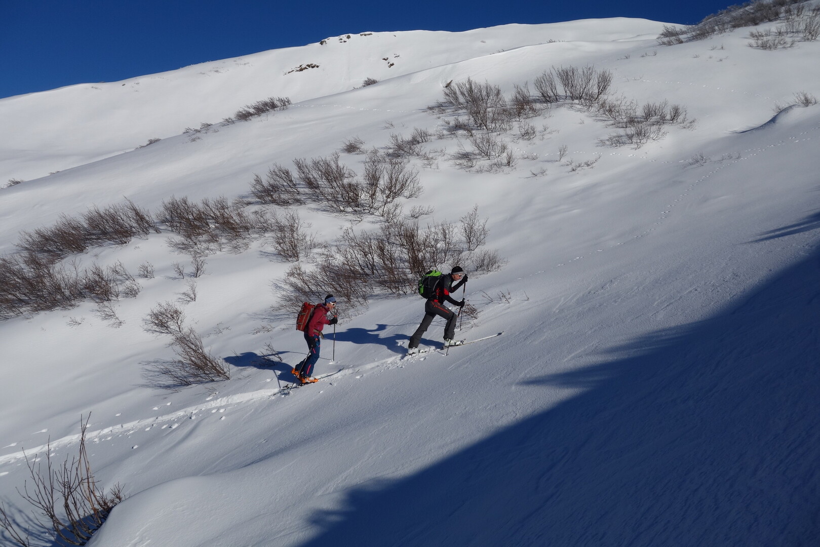 Wo der Schatten mehr als Sonne bietet: Ein unkonventionelles Skitourenerlebnis im Banne massiger Berge. Zwar beginnt die Tour mit einem etwas ruppigen Einstieg, doch ist das der Preis, um die wunderschönen Hänge und Mulden im oberen Bereich ohne Fremdeinwirkung zu befahren und zu geniessen.